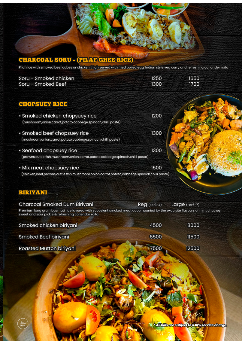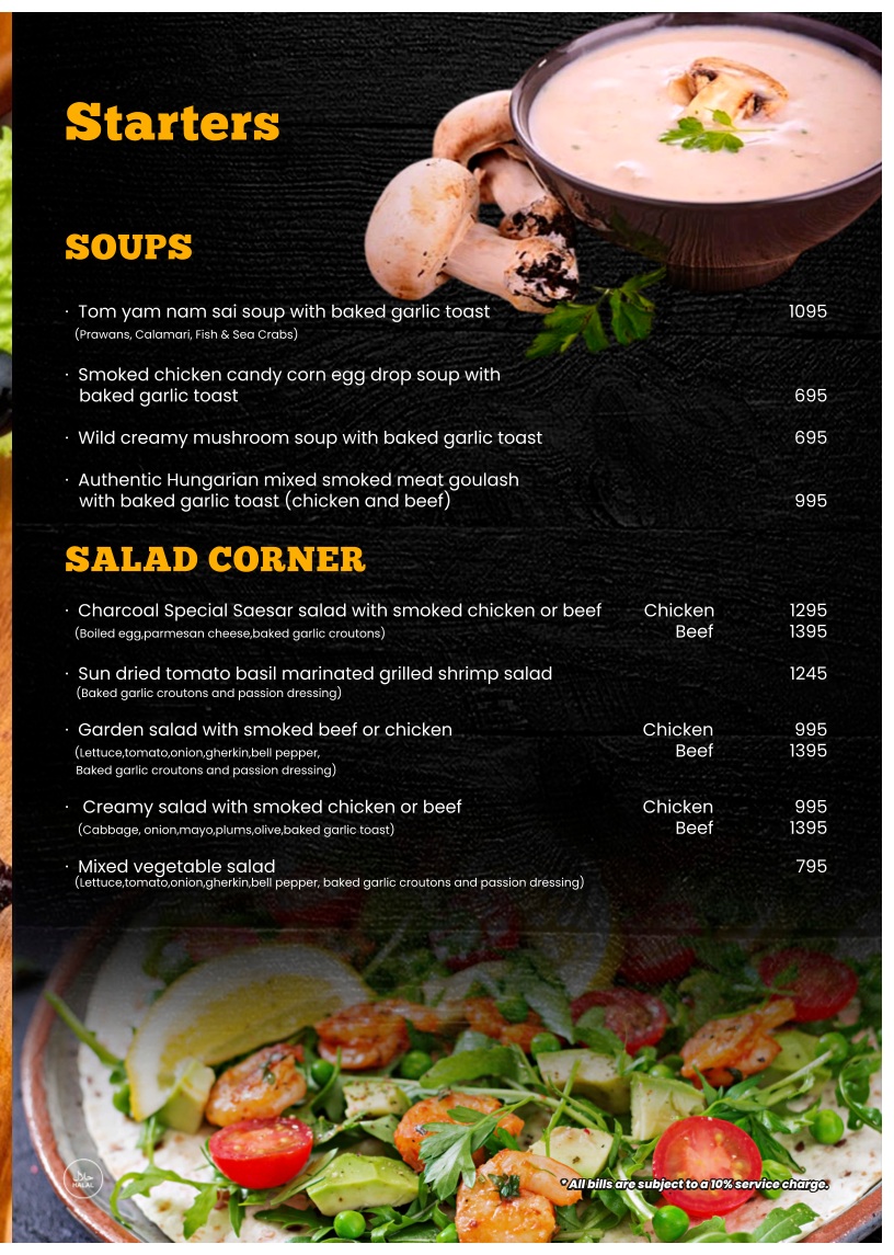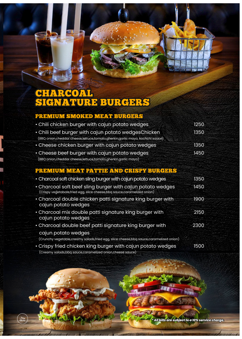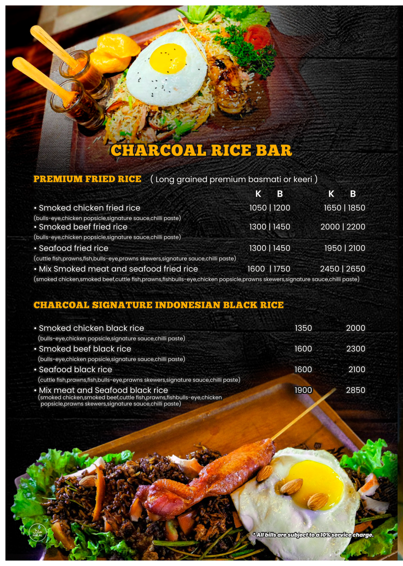 The menu at Charcoal Smoke House offers a diverse selection of dishes, ranging from hearty soups to indulgent desserts. For starters, you can try the rich Tom Yam Nam Sai Soup with baked garlic toast or the creamy Wild Creamy Mushroom Soup. The Charcoal Special Caesar Salad is available with either smoked chicken or beef, while grilled shrimp fans will enjoy the Sun Dried Tomato Basil Marinated Grilled Shrimp Salad. Main courses feature a wide variety of premium smoked meats, including the Hammermans Beef Chop and Charcoal Premium Beef Steak, as well as flavorful chicken dishes like the Charcoal Signature Chicken Whole Leg and Honey Glazed Smoked Chicken Leg. If you're in the mood for seafood, the Grilled Fish Steak and Smoked Turkey Roulade are excellent choices. The menu also includes indulgent sides such as Classic Mashed Potato and Indonesian Black Rice. For a more indulgent experience, opt for one of the Charcoal Mix Meat Platters, which come in Bronze, Silver, Gold, Diamond, or Platinum options. The Premium Smoked Meat Submarines, Smoked Meat Wraps, and Premium Meat Pattie and Crispy Burgers offer delicious handheld options, each served with cajun potato wedges. If you're craving something flavorful, the Premium Fried Rice options, such as Smoked Chicken Fried Rice or Seafood Fried Rice, are sure to satisfy. For pasta lovers, there are dishes like Alfredo Smoked Chicken Pasta and Beef Bolognese Spaghetti. Don't miss the decadent Imorich Hazelnut Gelato or the Banana French Toast for dessert, rounding off a truly satisfying meal.