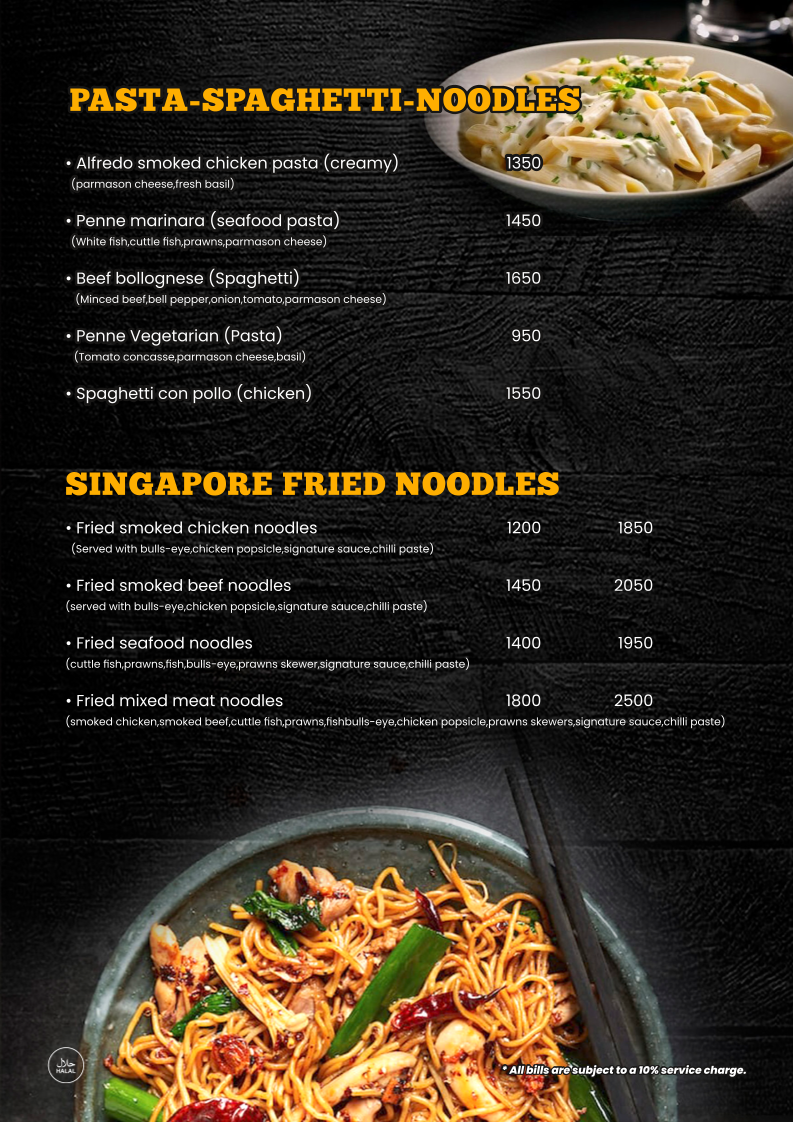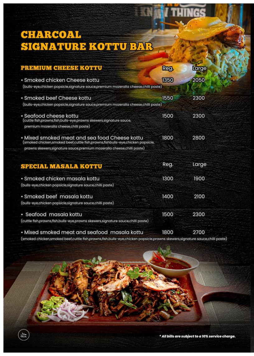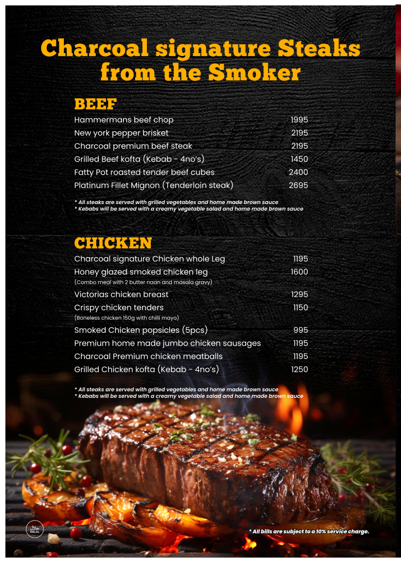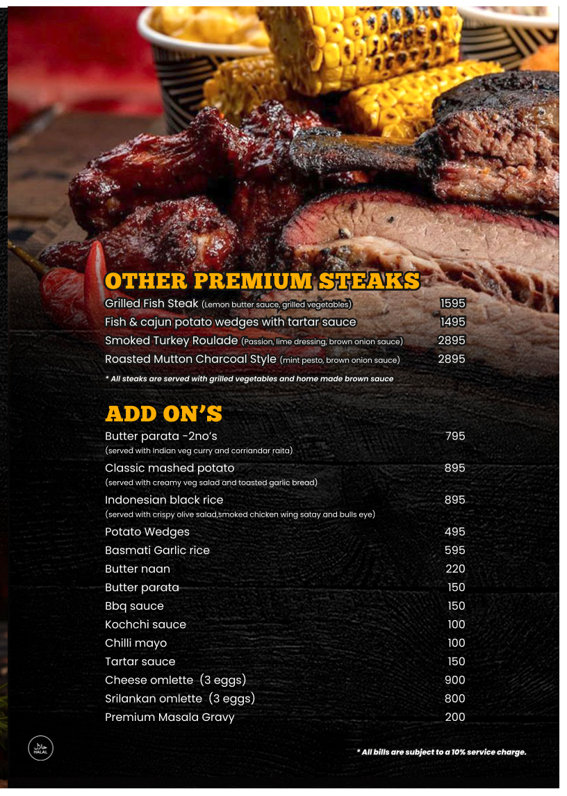 The menu at Charcoal Smoke House offers a diverse selection of dishes, ranging from hearty soups to indulgent desserts. For starters, you can try the rich Tom Yam Nam Sai Soup with baked garlic toast or the creamy Wild Creamy Mushroom Soup. The Charcoal Special Caesar Salad is available with either smoked chicken or beef, while grilled shrimp fans will enjoy the Sun Dried Tomato Basil Marinated Grilled Shrimp Salad. Main courses feature a wide variety of premium smoked meats, including the Hammermans Beef Chop and Charcoal Premium Beef Steak, as well as flavorful chicken dishes like the Charcoal Signature Chicken Whole Leg and Honey Glazed Smoked Chicken Leg. If you're in the mood for seafood, the Grilled Fish Steak and Smoked Turkey Roulade are excellent choices. The menu also includes indulgent sides such as Classic Mashed Potato and Indonesian Black Rice. For a more indulgent experience, opt for one of the Charcoal Mix Meat Platters, which come in Bronze, Silver, Gold, Diamond, or Platinum options. The Premium Smoked Meat Submarines, Smoked Meat Wraps, and Premium Meat Pattie and Crispy Burgers offer delicious handheld options, each served with cajun potato wedges. If you're craving something flavorful, the Premium Fried Rice options, such as Smoked Chicken Fried Rice or Seafood Fried Rice, are sure to satisfy. For pasta lovers, there are dishes like Alfredo Smoked Chicken Pasta and Beef Bolognese Spaghetti. Don't miss the decadent Imorich Hazelnut Gelato or the Banana French Toast for dessert, rounding off a truly satisfying meal.