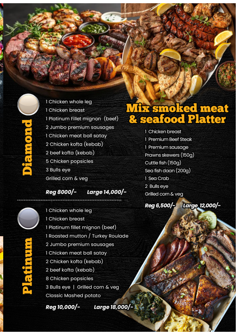 1 Chicken whole leg, 1 Chicken breast, 1 Platinum fillet mignon (beef), 1 Roasted mutton / Turkey Roulade, 2 Jumbo premium sausages, 1 Chicken meat ball satay, 2 Chicken kofta (kebab), 2 beef kofta (kebab), 8 Chicken popsicles, 3 Bulls eye